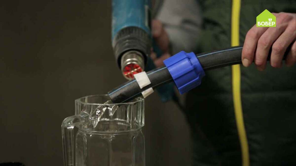 Случается, что ледяная пробка в трубе достигает в длину 2-2,5 метра, и растопить её в зимний период очень сложно. Наш мастер покажет способ, который 100 % работает. Это самый простой способ борьбы с ледяной пробкой. Прогревайте трубу на длину 30-40 см возвратно-поступательными движениями. Чтобы вы увидели сколько воды вышло, подставьте под трубу пустую ёмкость.Минус такого способа: трубу можно прогреть только в зоне видимости; если труба уходит в фундамент или в грунт, сделать этого не получится. В ёмкость засыпьте соль и залейте горячей кипячённой водой. У вас должен получиться довольно концентрированный раствор. Размешайте соль, избавившись от больших комочков, чтобы они не забили насос. За счёт циркуляции жидкости внутри системы водоснабжения в течение очень короткого времени соль растворится и перемешается полностью. Вставьте шланг в насос. В нашем случае шланг меньшего диаметра, чем насос, поэтому необходимо намотать на него немного изоленты, чтобы уплотнить соединение. Отсоеди