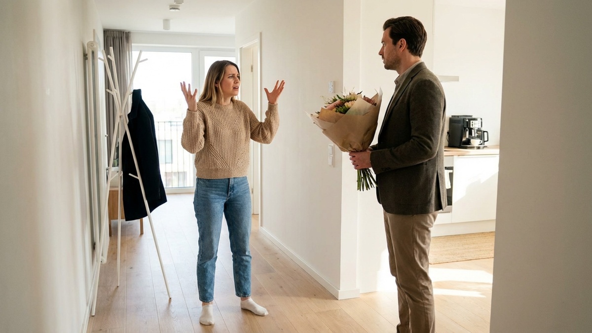 Я стояла в прихожей с пакетом молока в руках и смотрела, как муж отряхивает снег с плеч. В другой руке у него был огромный букет — алые розы, штук пятнадцать, не меньше.