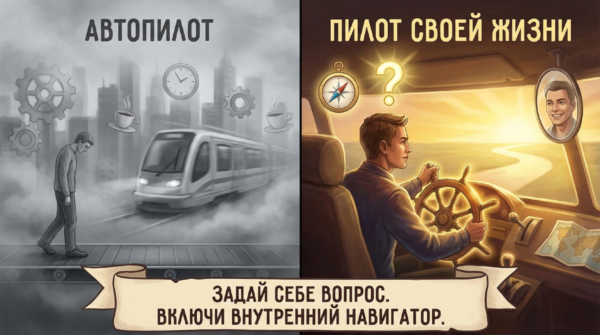 Просыпаешься утром, и кажется, что день уже расписан до последней минуты. Кофе, работа, быт, вечер, снова кофе, и так по кругу. Мы бежим, спешим, что-то постоянно делаем, но порой возникает ощущение, будто не мы рулим этим скоростным экспрессом, а он сам несёт нас куда-то без спроса. Сейчас я познакомлю тебя с очень простым инструментом, способным мгновенно вернуть тебе штурвал твоей собственной жизни? Он всегда с тобой, всегда доступен. Это умение задавать себе вопросы. Да-да, просто спрашивать. Большинство людей живут на автопилоте. Они реагируют на события, но не создают их. Они идут по проторенным дорогам, но не прокладывают свои тропы. И в этом главное отличие: ты можешь быть пассажиром в собственной жизни, а можешь - её бесстрашным пилотом. Какое место выбираешь? Когда мы не спрашиваем себя, чего мы на самом деле хотим, почему делаем то или иное, куда движемся, мы отдаем бразды правления случайности, чужим ожиданиям, старым привычкам. Мы словно блуждаем в тумане, не видя и не по