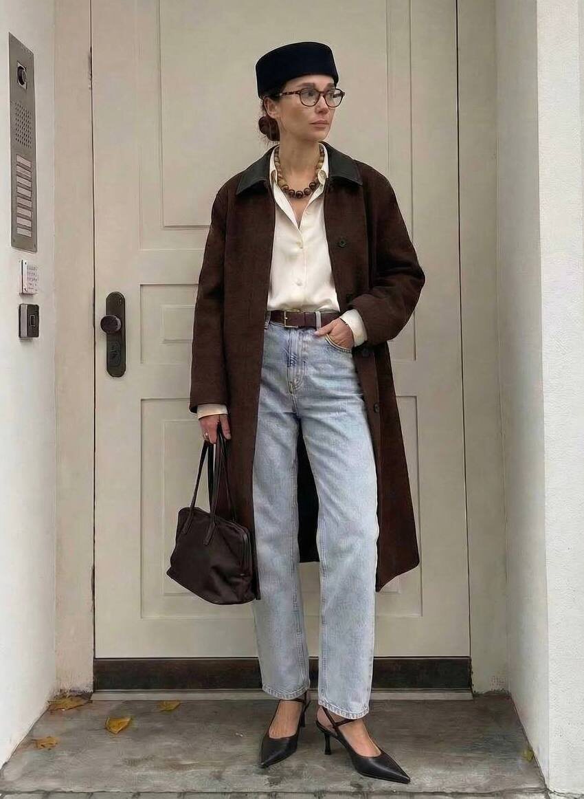 Элегантный повседневный образ с лёгким парижским настроением: коричневое пальто, светлая рубашка и лаконичные аксессуары
