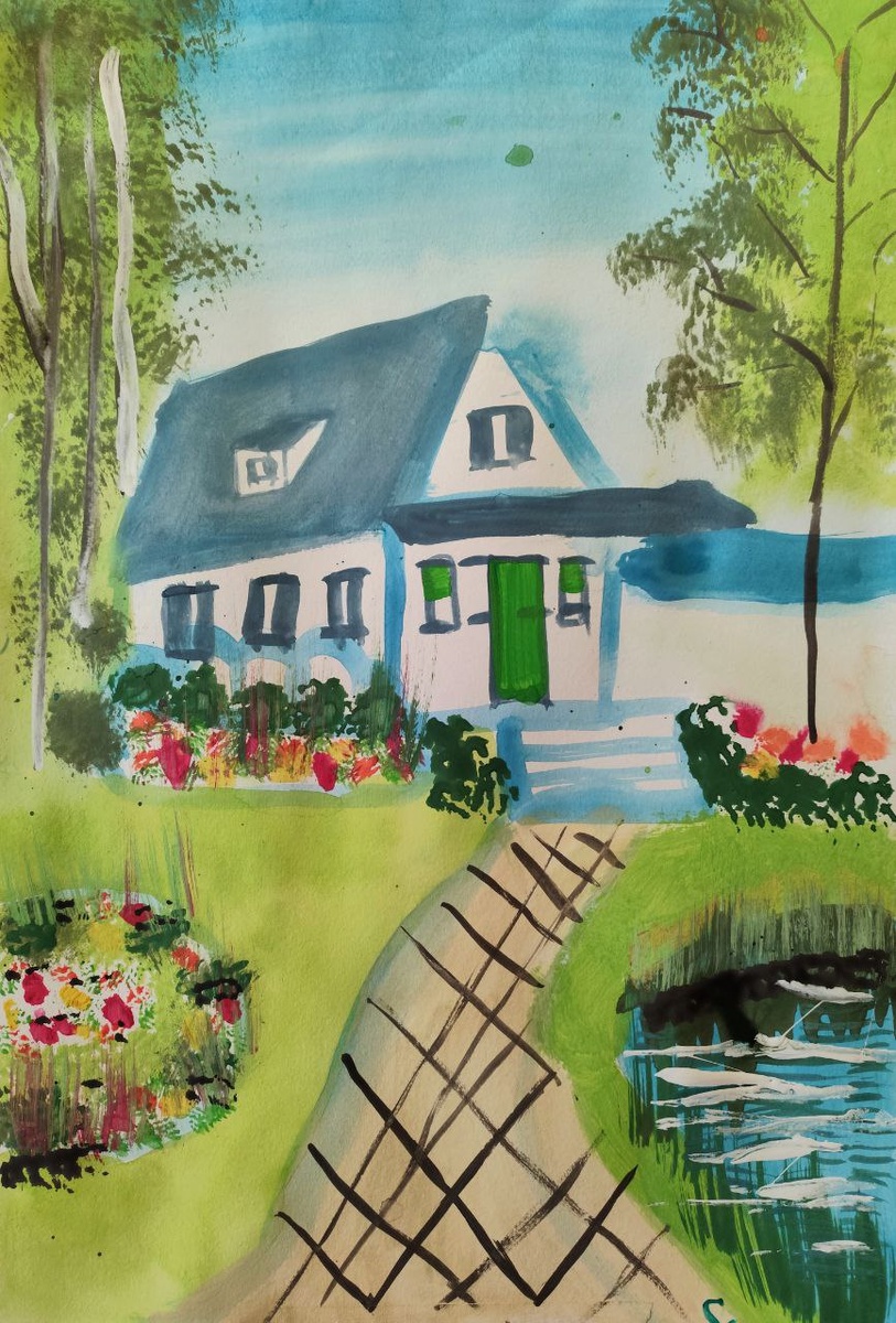 Референс ученик выбрал на Pinterest, а дальше уже начали искать свою интерпретацию. Писали гуашью на плотной акварельной бумаге формата А3. При этом попробовали несколько разных техник. Сначала сделали мягкие акварельные заливки для неба и воды. Потом добавили фактуру дорожки мастихином. Отдельно разобрали отражение в воде — как оно строится и почему не повторяет объект буквально. Постепенно собрали всю композицию: дом, сад, дорожку, пруд. В итоге получилась самостоятельная работа. Не копия картинки, а своя версия пейзажа. Такие занятия подходят даже тем, кто уверен, что «рисовать не умеет». За час у человека появляется готовая картина и понимание нескольких базовых художественных приёмов. Провожу индивидуальные уроки рисования у вас дома. Формат занятия: 1 час работы спокойное пошаговое объяснение сюжет подбираем под ваш уровень Стоимость — 3500 ₽. Если хотите попробовать — напишите в личные сообщения. Иногда достаточно одного занятия, чтобы человек неожиданно для себя понял: р