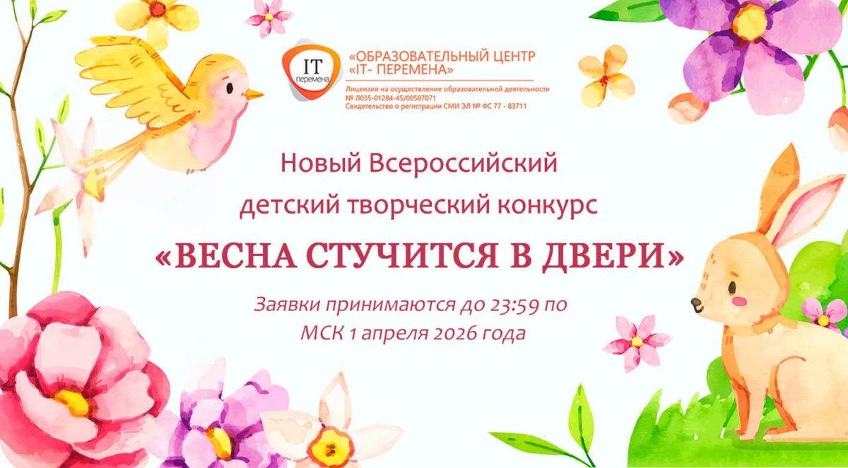 »! Тихо? Прислушайтесь! Это не просто капель за окном. Это весна робко стучится в наши двери — лучиком солнца, первой проталиной, звонкой птичьей трелью. Она сменяет снежные пледы на голубое небо и несёт в город свежесть талого снега и аромат набухших почек. Мы объявляем творческий конкурс «Весна стучится в двери»! Самое время распахнуть створки и впустить тепло в свою жизнь. Какой вы видите весну? Может быть, это солнечный зайчик на стене? Или первая зелень, что смело пробивается сквозь прошлогоднюю листву? А может, это портрет самой красавицы-Весны в венке из подснежников? Не бойтесь проявить свою фантазию — ведь весна уже в пути! Электронные наградные документы - бесплатно! Заявки принимаются до 1 апреля 2026 года включительно. Ссылка на конкурс: https://itperemena.ru/vesna