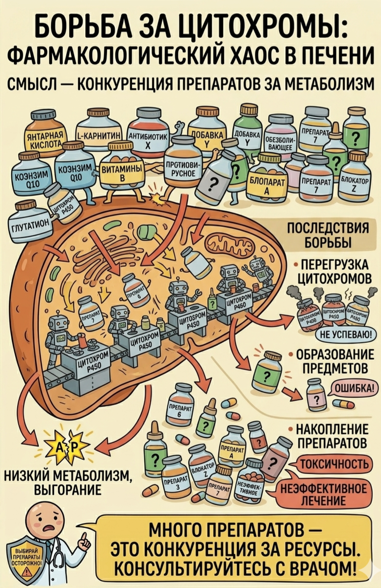 «Коктейльный драйв» или фармакологический хаос? Почему 5 препаратов - это предел. «Доктор, а можно мне еще витамин С, железо, мельдоний и что-нибудь для печени в одну капельницу?» - этот вопрос я слышу постоянно. Пациентам кажется: чем больше компонентов, тем быстрее наступит «оздоровление». Как клинический фармаколог, я говорю: НЕТ. И вот почему. В медицине есть жесткий термин - Полипрагмазия. Это когда пациенту назначают слишком много лекарств одновременно. И это не просто «мнение врача», это вопрос безопасности, закрепленный в законе. 1. Правило «Пяти»: Юридическая граница Знаете ли вы, что даже в стационарах (больницах), если врач хочет назначить пациенту более 5 препаратов одновременно, он не может сделать это единолично? Для этого созывается Врачебная комиссия (ВК). Почему? Потому что риск непредсказуемых реакций растет в геометрической прогрессии. Если 2 препарата изучены на взаимодействие, то 5 и более - это уже «химический эксперимент» над вашим организмом, результат ко