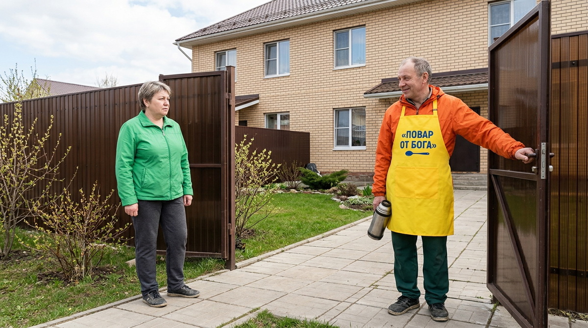 Стук раздался через десять минут. Людмила открыла входную дверь и увидела Краснова с термосом в руках. Он был в дурацком фартуке с надписью «Повар от Бога», и вид у него был такой, будто он сам не уверен, что правильно делает.