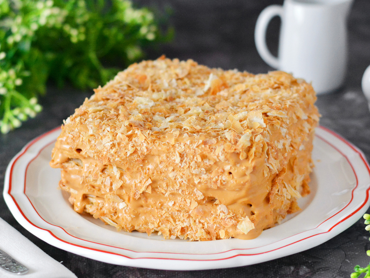 Идеальный вариант, когда хочется домашнего торта, но нет времени долго возиться с тестом. Хрустящие слоёные коржи быстро выпекаются, а затем пропитываются нежным кремом с варёной сгущёнкой и становятся мягкими и очень вкусными. Получается простой, но при этом по-настоящему праздничный десерт. Торт выходит ароматным, слоистым и буквально "исчезает" со стола... Полный список ингредиентов - в конце⤵️ Размораживаем 1 кг бездрожжевого слоёного теста. Если тесто пластинами - просто отделяем их друг от друга и даём полностью разморозиться. Разогреваем духовку до 180 градусов. Кладём пластины теста на противень с пергаментом, не раскатываем и выпекаем примерно 15-20 минут, пока тесто хорошо подрумянится и станет золотистым. Остужаем. Каждую пластину аккуратно разделяем вилкой на 2 коржа - всего получается 8 коржей. С верхнего подрумяненного слоя снимаем немного крошки - она понадобится для обсыпки торта. Теперь делаем крем. В миску кладём 180 г мягкого сливочного масла и взбиваем миксером до г
