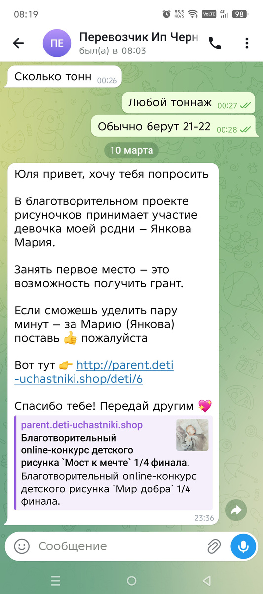 Наивно полагать, что мошенники — это дураки или случайные люди. Надо помнить, что они профессионалы, у которых хорошо продуманные схемы. Они не от балды придумывают, как нас развести, они готовятся, покупают базы с нашими данными, создают фишинговые страницы или даже целые сайты. Фишинг от слова fishing — рыбная ловля. Я всегда рассказываю случаи, которые произошли со мной лично, чтобы уберечь кого-нибудь от этих нелюдей. Итак, очередной случай. Приходит мне сообщение от моего контрагента-перевозчика с просьбой проголосовать за ребенка. Тут я немного отклонюсь от темы. Я в принципе не люблю голосовать по просьбе. Считаю, что это нечестно по отношению к детям, чьи родители не имеют большой аудитории. Представьте маму блогера с тысячной аудиторией. По ее просьбе за ее ребенка проголосуют, но это не будет объективной оценкой. Я готова проголосовать, но только по-честному, за того, кто реально
