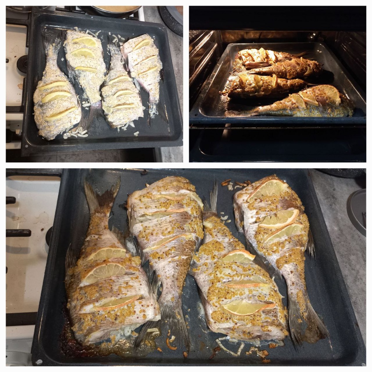 Отгадайте ребус: Муж поехал на рыбалку. Не поймал ни одной рыбины, но привёз 5 кило подлещиков. Ингредиенты: Лещ/подлещик свежевыловленный или охлажденный - 0,6-0,8 кг × 4 шт. Репчатый лук - 1 шт. средний Свежий укроп ( можно сушеный) - 1/2 пучка Лимон - 1/2 шт. Растительное масло - по вкусу Зернистая горчица - 2 ст.л. Сметана - 2 ст.л. Соль - по вкусу Смесь перцев - по желанию Подготовка: 1. Леща почистить и отрезать голову. 2. Надрезать снизу и выпотрошить. После чего рыбу нужно промыть в проточной воде и слегка просушить бумажной салфеткой. Затем посолить со всех сторон и переложить на тарелку для дальнейшей подготовки. Приготовление ⬇️