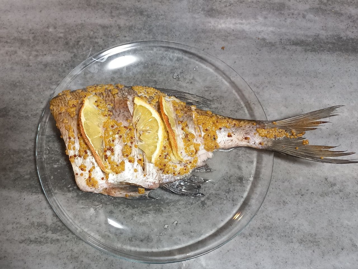 Очистить лук и нашиновать полукольцами. Мелко нарубить укроп. Перемешать и начинить смесью лука с укропом брюшко. 4. На боку с одной стороны тушки острым ножом сделать небольшие (я делаю глубокие😁) прорези. Нарезать лимон тонкими дольками. Вставить их в прорези. 5. Положить леща в смазанную маслом форму. 6. Немного поперчить и смазать кожу зернистой горчицей, перемешанной со сметаной, с помощью силиконовой кисточки. 7. Поставить форму в заранее разогретую до 200 °С духовку. Рыба должна сразу прихватиться. Готовить ~25 минут. Лещ, запеченный в духовке, готов к подаче на стол! #нюансы Частично остудить в духовке с открытой дверцей, потом переложить в контейнер до полного остывания. И только потом убрать в холодильник. Если подаете сразу, то аккуратно перенести каждую рыбину на плоскую тарелку. Можно украсить свежей зеленью или овощами.
