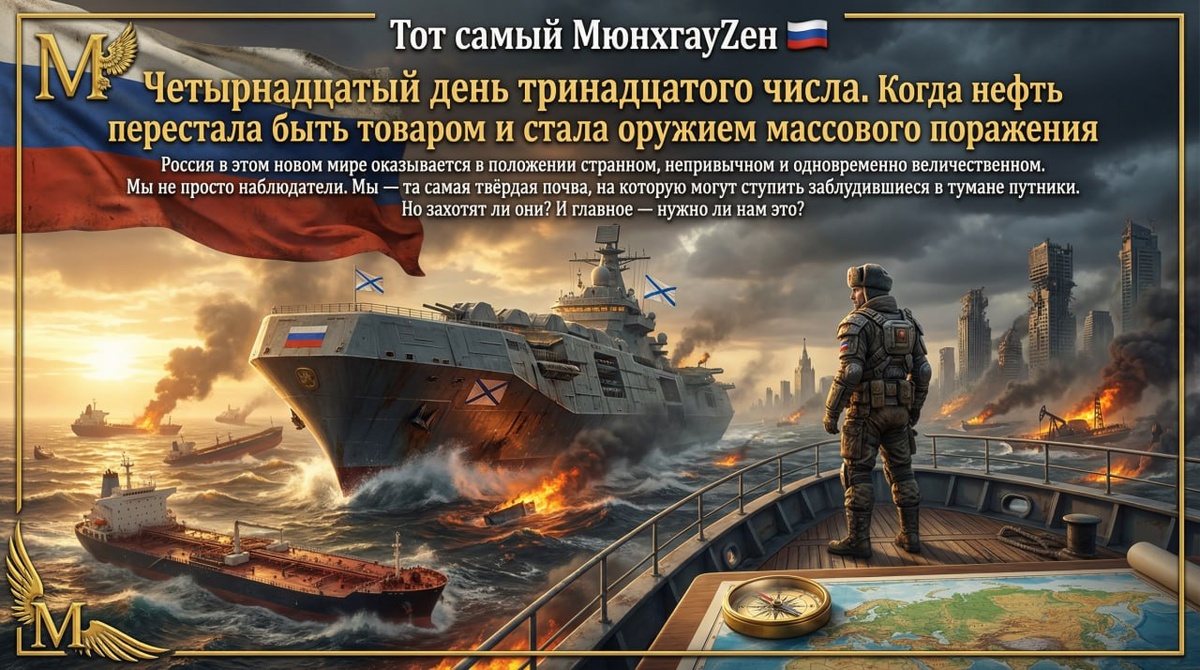 🚨 Колонка МюнхгауZена: Четырнадцатый день тринадцатого числа. Когда нефть перестала быть товаром и стала оружием массового поражения Есть в истории человечества моменты, которые потомки назовут «точками бифуркации» — те самые развилки, где старые дороги уходят в никуда, а новые ещё не протоптаны. Таким моментом стала пятница, 13 в марте 2026 года. День, когда война в Персидском заливе перестала быть локальным конфликтом и превратилась в детонатор, взорвавший фундамент мировой финансовой системы. Две недели назад никто не верил, что Иран способен на большее, чем ракетные удары возмездия. Сегодня Тегеран, сам того, возможно, не желая, разорвал шаблон, по которому жила глобальная экономика полвека. Нефтедолларовая машина, исправно качавшая богатства из недр Аравии в сейфы Уолл-стрит, дала сбой. И теперь мир лихорадочно ищет ответ на вопрос: а что дальше? Россия в этом новом мире оказывается в положении странном, непривычном и одновременно величественном. Мы не просто наблюдатели. Мы —