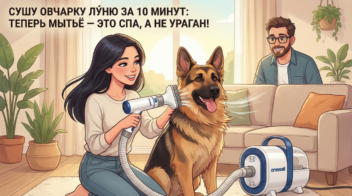Я давно поняла: помыть овчарку — искусства не требуется, а вот высушить Лу́ню, не превратив квартиру в филиал груминг-салона и не вырастив в душе раздражение, равное трём рабочим дням, — тут нужен талант, железные нервы и, желательно, чудо техники. И вот однажды я его нашла: фен-компрессор для животных ONEISALL (посмотреть на него можно тут). Вот отсюда всё и началось.
