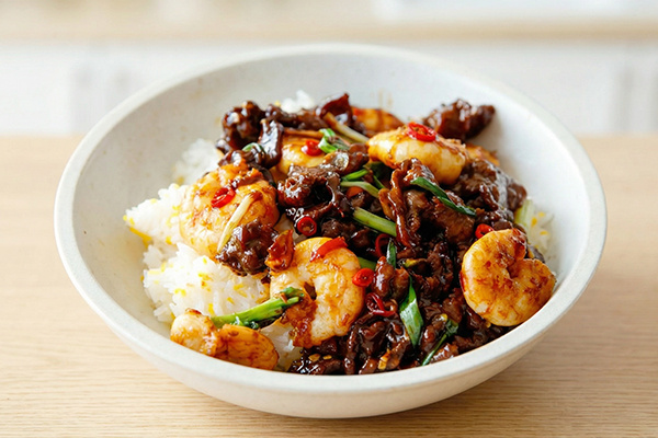 В китайской домашней кухне белки обычно не любят толпу. Свинину жарят со стручковой фасолью, говядину — с сельдереем или снежным горошком, креветки — с луком, чесноком, чем угодно, но обычно сами по себе. У каждого продукта свой ритм, своя температура, свое время на огне. Поэтому сочетание говядины и креветок в одном блюде кажется почти вызывающим. Слишком разные. Слишком легко сделать так, что один продукт уже готов, а другой только начал. И именно поэтому такое сочетание особенно интересно. Оно держится не на эффектной идее «всего и побольше», а на точности.