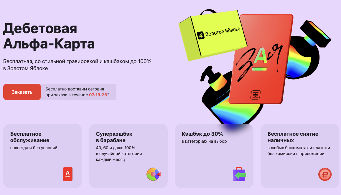 Дебетовая карта от Альфа-Банка остаётся одним из самых обсуждаемых розничных продуктов в России. В марте 2026 года банк сохраняет условия, которые делают её удобным инструментом для повседневных расчётов: бесплатный выпуск и обслуживание, кэшбэк рублями и процент на остаток. Разберём, что конкретно предлагает карта прямо сейчас и кому она подходит больше всего. Карта выпускается бесплатно и обслуживается без ежемесячной платы — без дополнительных условий и независимо от суммы на счёте. Выпуск бесплатный — карту привозят курьером или можно забрать в отделении банка. Проверить актуальность информации на сегодня Программа лояльности построена на выборе: каждый месяц клиент выбирает 3 категории с повышенным кэшбэком, остальные покупки приносят 1%. В актуальном списке доступны наиболее выгодные категории: маркетплейсы — 10%, красота — 10%, одежда и обувь — 10%, аптеки — 10%, связь и интернет — 10%, кафе и рестораны — 5%, продукты — 3%, такси — 2%, коммунальные услуги — 2%. Лимит возврата дл
