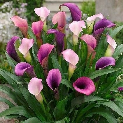 Это компактные клубневые каллы (до 40-50 см высотой) с узкими листьями. Именно среди них встречаются самые разнообразные и яркие окраски: розовые, сиреневые, бордовые, чернильные.