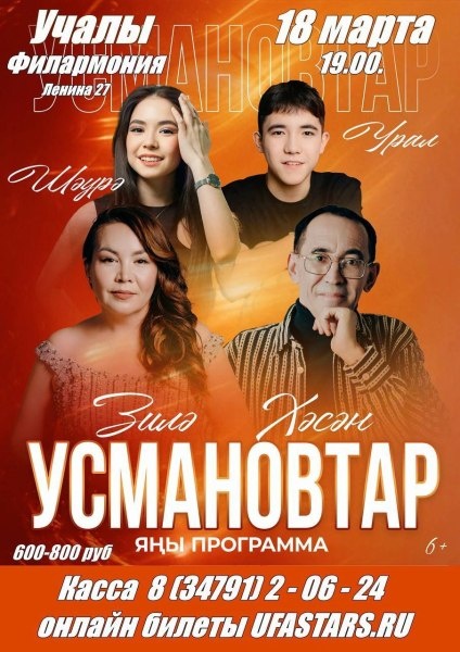 Друзья! Приглашаем вас окунуться в мир зажигательной музыки и ярких эмоций вместе с музыкальной семьей Усмановых ! Готовьтесь зарядиться энергией и ритмом, ведь впереди яркое шоу, наполненное любимыми хитами и неповторимой атмосферой Добро пожаловать на концерт! Нач. 19:00 Билеты в продаже в кассе Учалинской филармонии, цена 800 р. Касса работает в будние дни с 10:00 до 19:00, перерыв 14:00-15:00 Билеты онлайн — clck.ru/3RqTJC Справки по 8 347 912 06 24 Источник https://uchaly102.ru/?p=129379