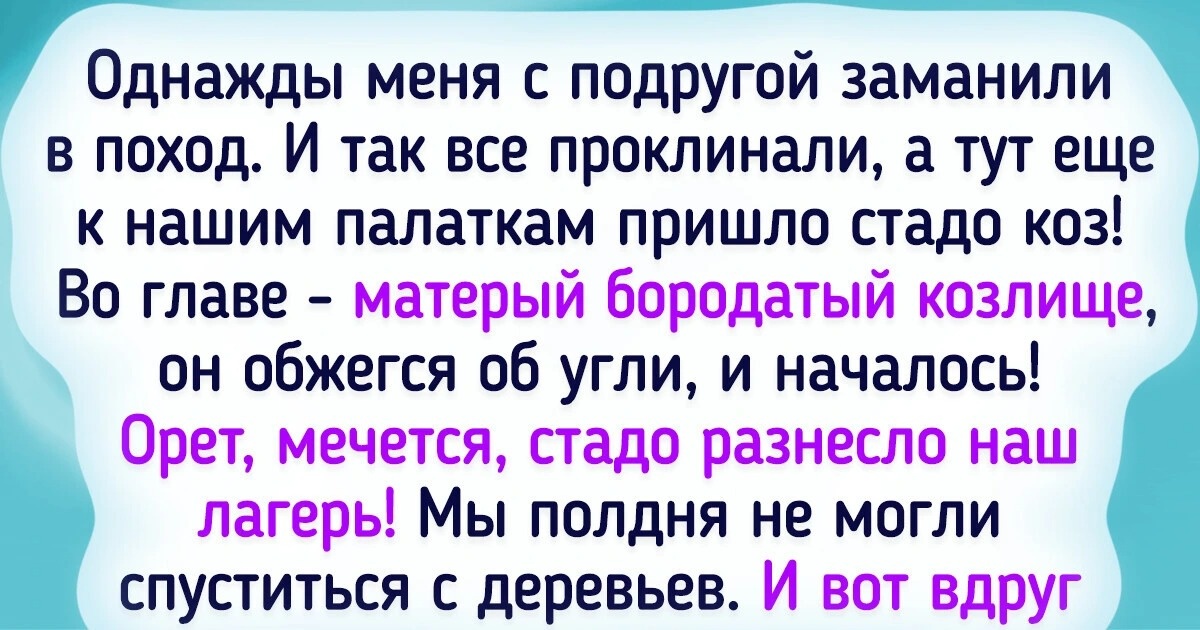Однажды меня с подругой заманили в поход. И так все проклинали, а тут еще к нашим палаткам пришло стадо коз! Во главе - матерый бородатый козлище, он обжегся об угли, и началось! Орет, мечется, стадо разнесло наш лагерь! Мы полдня не могли спуститься с деревьев. И вот вдруг они сами ушли, когда уже стемнело, оставив совершенно разоренный лагерь. Кроме того, они сожрали большую часть продуктов. Спали мы в ту ночь под открытым небом в остатках тента. Лежим с подружкой, смотрим на звезды. И вдруг она говорит: "Я больше не могу." Отвечаю, что я тоже. Посмотрели друг на друга, встали, тихо собрали вещи, какие выжили - и бежали под покровом темноты. Оставили записку, что просим нас извинить, но мы явно переоценили свои силы и дальше не пойдем, желаем им удачи. © Татьяна Лобанова / ADME