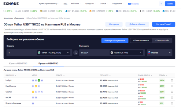 Для этого используют специальные мониторинги, где собраны лучшие криптообменники в Москве, их расположение и формат работы. Один из таких сервисов — Exnode, где можно посмотреть рейтинг криптообменников в Москве и сравнить разные варианты.