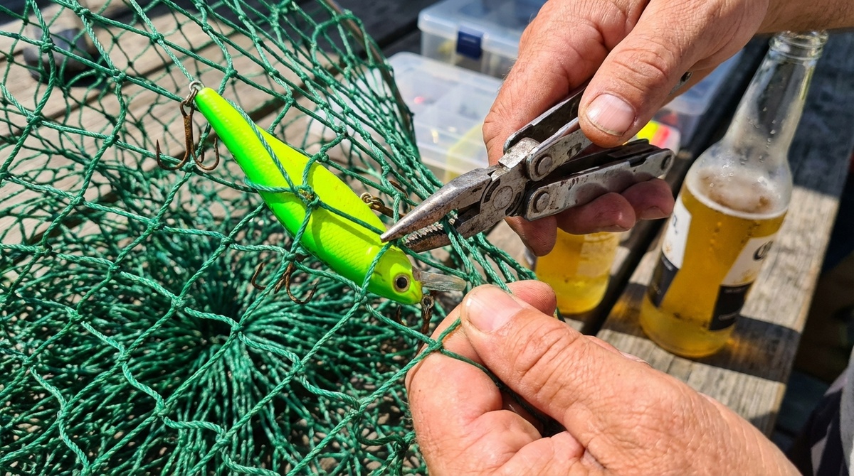 К выбору оснастки я подошел серьезно. На конце стоял метровый поводок из толстого флюорокарбона диаметром 0.6 мм — он отлично противостоит истиранию о колонии острой ракушки-дрейссены, которой усыпаны русловые свалы. В качестве приманки я выбрал огромный воблер Halco Sorcerer с заглублением до восьми метров. Вода из-за жары уже начала слегка "цвести" и помутнела, поэтому цвет воблера взял провоцирующий — ядовито-зеленый "кислотник", чтобы судак заметил его издалека.