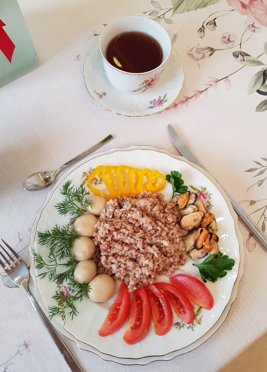 Добрый день, дорогие друзья! Сегодня я представляю вашему вниманию гречневую кашу с постным маслом. Для приготовления 4 порций нам понадобятся: 200 грамм гречневой крупы, 400 грамм воды, 4 грамма соли, 15 грамм масла из виноградных косточек. Для оформления 4 порций нам понадобятся: 100 грамм маринованных шампиньонов, 100 грамм мидий, 200 грамм помидор, 80 грамм сладкого перца, 10 грамм укропа, 5 грамм петрушки. Приготовление: воду довести до кипения, посолить. Промыть крупу в холодной воде. Отбросить гречку на мелкое сито. Высыпать крупу в кастрюлю с кипятком. Варить в течение 15 минут на среднем огне под крышкой. Добавить растительное масло, перемешать. Разложить кашу по тарелкам, дополнить блюдо маринованными шампиньонами, отварными мидиями, свежими помидорами, сладким перцем, укропом и петрушкой. Приятного аппетита!