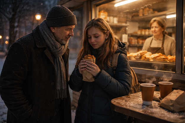 Кузьмич не торопил, шёл рядом, молчал. В ларьке было тесно и тепло, пахло тестом и чем-то луковым. Тётка за прилавком знала Кузьмича: