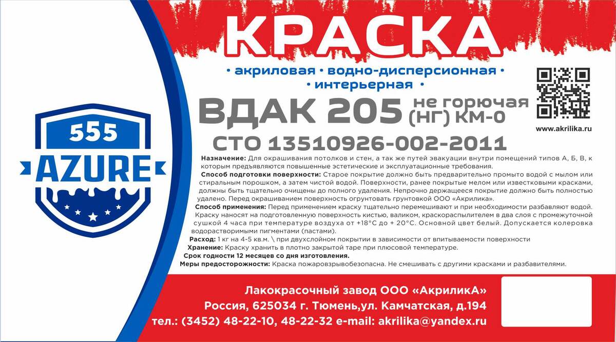 ВД-АК 205 «Интерьерная» производится компанией ООО «Акрилика» (г. Тюмень). Получить подробную консультацию по подбору цвета, рассчитать необходимое количество материала и оформить заказ можно на официальном сайте или по телефону: