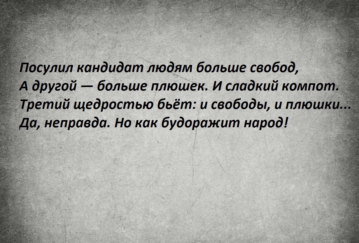 Не знаю, как вы, а я что-то не припомню, чтобы предвыборные обещания хоть кем-то полностью и по-настоящему выполнялись. Ответственности-то за невыполнение как таковой нету. До следующих выборов — точно нету. А там и нового понаобещать можно будет. Да побольше!