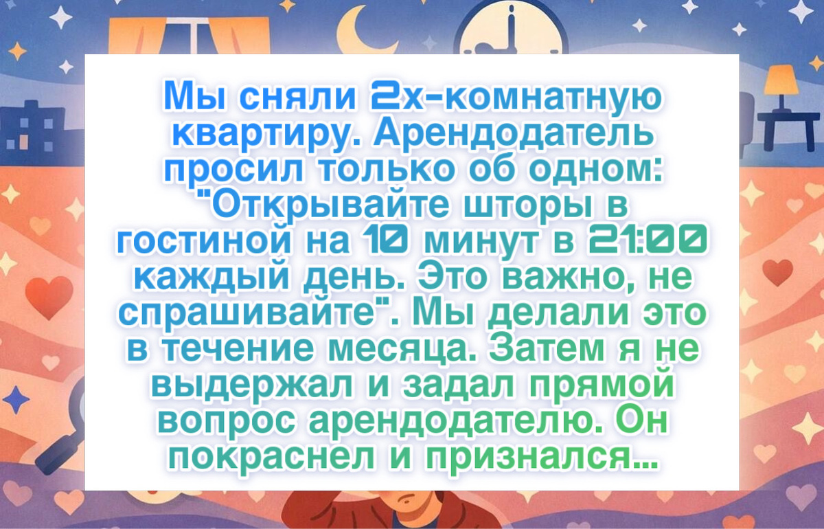 “Мы снимали двухкомнатную квартиру. Хозяин попросил только об одном: «Каждый день ровно в 21:00 открывайте шторы в гостиной на десять минут. Это важно, не спрашивайте почему». Мы так делали примерно месяц. Потом я не выдержал и напрямую спросил его. Он покраснел и признался: «Моя мама живет в доме напротив. Если шторы открыты, она понимает, что со мной все в порядке и я жив. Если нет, она через пять минут уже бежит проверять. Я просто не сказал ей, что сдаю квартиру, не хотел ее волновать».”