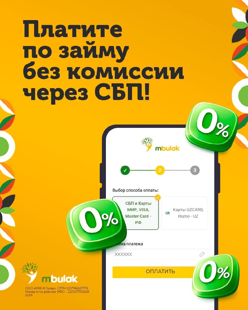 ! Оплачивайте займы в М Булак через Систему быстрых платежей (СБП) и экономьте! ✔ Комиссия 0 %. ✔ Оплата проходит быстро и безопасно ✔ Деньги поступают мгновенно ⚠️ Обратите внимание: при оплате не через СБП ваш банк может взимать дополнительную комиссию. ✅ Платите безопасно только: • на сайте www.molbulak.ru • в приложении М Булак • в кассах М Булак