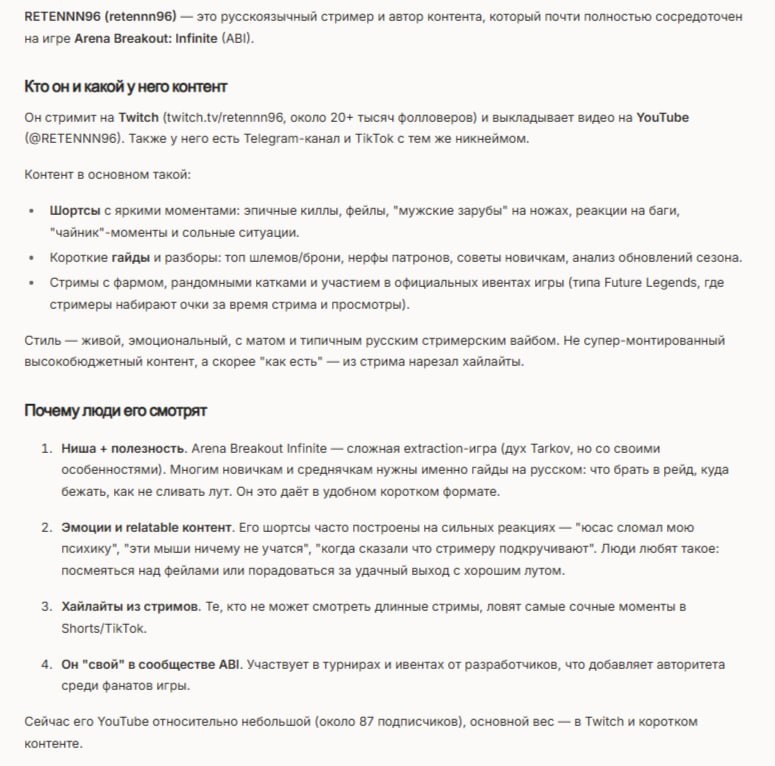 ! В последнее время я действительно переживаю за свой контент и сижу постоянно ломаю голову, как начать расти медийно и зачем оно вообще всё мне нужно? Сейчас я бы назвал этот промежуток времени — переломным моментом, потому что я начал понимать собственные ошибки, возьмём даже подачу контента на ютубе, стиль монтажа, работа с превью и т.д. Копаюсь внутри себя и решил задать вопрос для ИИ, и вот что он выкатил по поводу меня. Главный шаг сейчас — принять свои ошибки и начать над ними работать. Спасибо вам за поддержку, я думаю без вашей поддержки — не было бы вообще ничего ❤️
