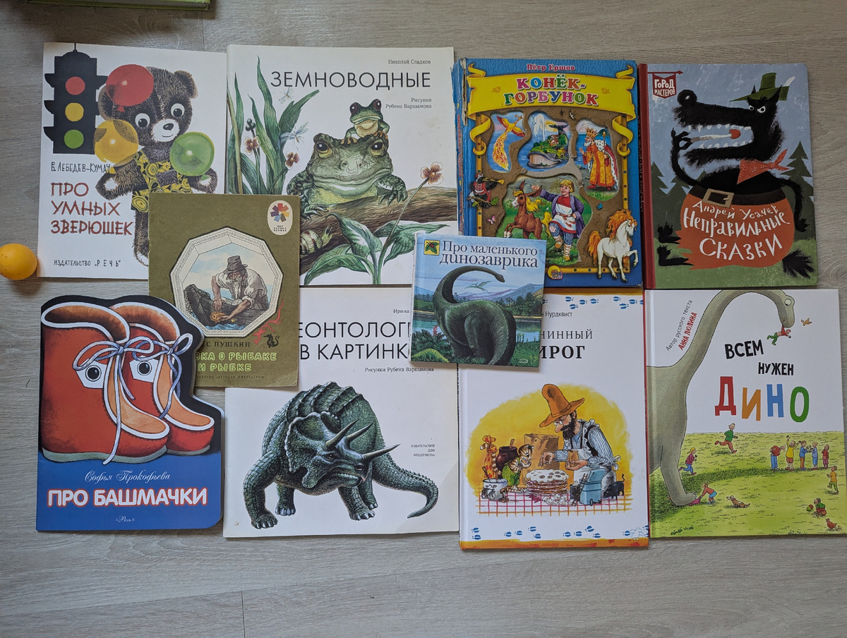 А вот и следующая порция книжек накопилась. Предыдущая была, в основном, зимняя. А под конец, когда зима, видимо, Лёню уже окончательно достала, он вспомнил о динозаврах.