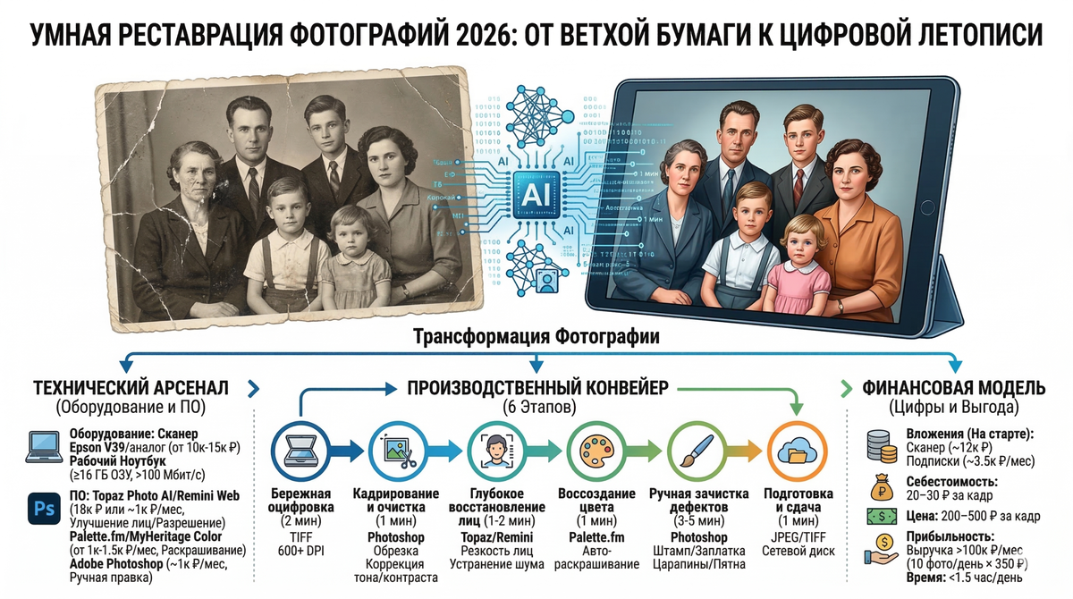 Рынок услуг по восстановлению старых снимков всегда стопорился из-за дороговизны ручного труда: художник-ретушер брал от 1000 рублей за одно фото, работая над ним часами. В 2026 году связка доступного оборудования и "умных" программ позволяет вам снизить себестоимость до 20–30 рублей за кадр, продавая услугу за 200–500 рублей. Ваша маржинальность составит свыше 1000%, а барьер входа останется на уровне покупки недорогого сканера и пары подписок на нужные службы. Вам не нужен сверхмощный компьютер, так как большинство сложных вычислений происходит на удаленных серверах (в облаке). 1. Аппаратная часть: 2. Основные программы (Арсенал для работы): Этот производственный конвейер состоит ровно из 6 этапов, которые нужно довести до автоматизма: Использование специализированного программного обеспечения переводит услугу реставрации из категории "долгое искусство" в категорию "быстрый и масштабируемый сервис". Ваши основные инвестиции — это покупка сканера (около 12 000 руб.) и ежемесячная опла