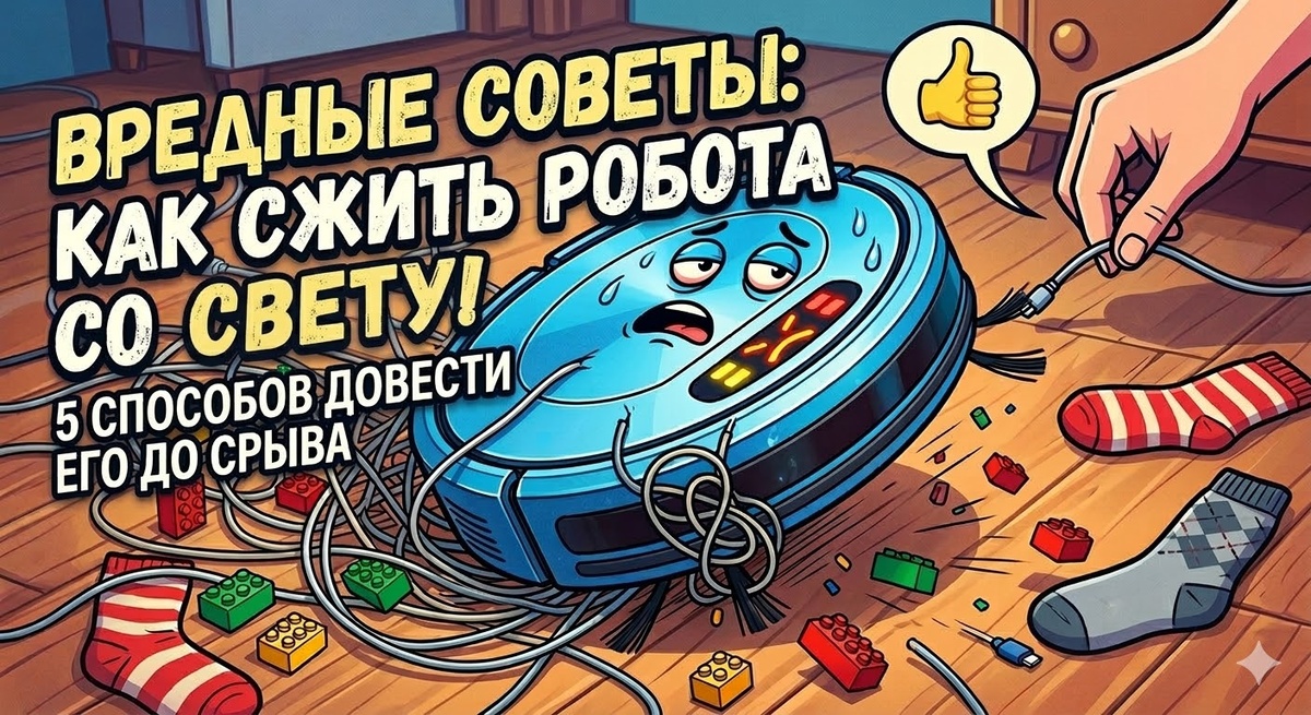В прошлой статье мы разбирали стадии принятия неизбежного — того факта, что робот-пылесос не помощник, а капризный механический подросток. Но что, если вы не хотите принимать? Что, если ваша цель — заставить этого пластикового наглеца страдать так же, как он заставляет страдать вас, съедая любимые наушники? Специально для вас я подготовил подборку «вредных советов» по воспитанию боевого киборга. Помните: ИИ — это громкое слово для мотора, чей девиз: «Вижу цель — бьюсь об неё лбом, пока она не исчезнет». Если ваш робот загрустил и катается по квартире без огонька, пришло время пересмотреть его диету. Пыль — это скучно и не по-пацански. Настоящий домашний тиран должен питаться калорийно. СОВЕТ: Помните, что лучший деликатес для его центральной щетки — это длинные, тонкие провода. Особенно от новых наушников или зарядки ноутбука. Пылесос заглатывает их с таким аппетитом, что сразу начинает издавать победные сигналы застрявшего мотора. А чтобы ему было вкуснее, не убирайте с пола раскидан
