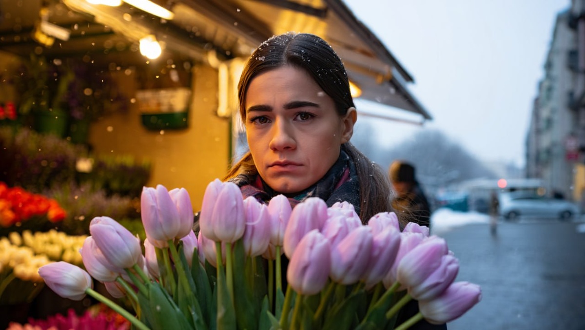 Улица встретила её холодом и запахом сырого асфальта. Цветочный ларёк на углу уже выставил вёдра с тюльпанами — жёлтыми, розовыми, белыми. Мимо торопились люди, кто-то нёс букет, обёрнутый в крафтовую бумагу, кто-то говорил в трубку: «Да, уже иду, уже купил».
