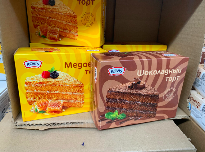 Начну с продуктов. В продаже появились торты KOVIS. Есть два варианта — медовый и шоколадный. Это небольшие бисквитные тортики с кремом, вес упаковки 240 граммов. Удобный вариант к чаю, особенно если хочется чего-нибудь сладкого, но не слишком большого. Производят их в Московской области, в городе Раменское. Цена 96 рублей 50 копеек.