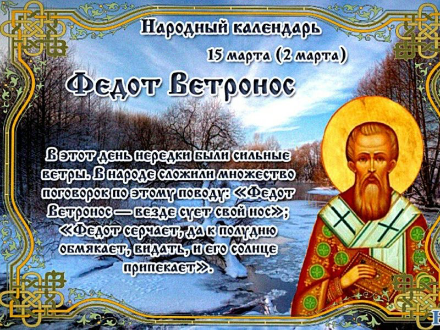 В воскресенье 15 марта 2026 года в народном календаре дата получила название Федот-ветронос, снежный занос, пометальник, водомет. Православная церковь 15 марта почитает священномученика Феодота, епископа Киринейского.