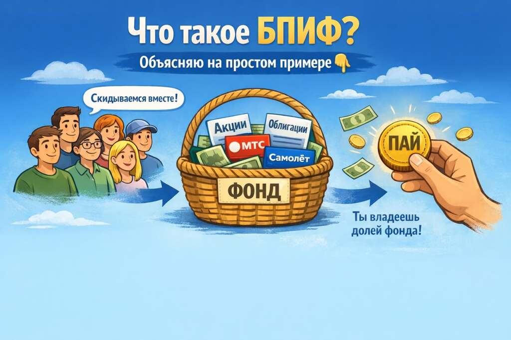 Если хочется инвестировать, но не хочется разбираться в сотнях бумаг - есть простой вариант. БПИФ - это биржевой паевой инвестиционный фонд. Звучит страшно, но на самом деле всё просто. Представь, что мы с тобой и ещё 10 друзьями решили купить акции и облигации, чтобы зарабатывать. Но покупать по одной бумаге - долго, дорого и страшно ошибиться. И тут кто-то говорит: — А давайте скинемся деньгами, купим сразу много разных активов, а потом поделим доход пропорционально тому, кто сколько внёс. Вот это и есть БПИФ. Ты покупаешь не саму акцию или облигацию, а долю в фонде (она называется пай). А фонд уже внутри владеет целой корзиной - десятками или даже сотнями разных бумаг. 👀 Как это выглядит в реальности? Допустим, ты купил пай фонда SBFR за 100 рублей. Внутри этого фонда кусочки облигаций разных компаний (МТС, Россети, Самолёт и других). Все они флоатеры (https://t.me/aparinaleksandr/65), то есть привязаны к ставке ЦБ. Ты ничего не выбираешь, не считаешь, не проверяешь рейтинги. Прост
