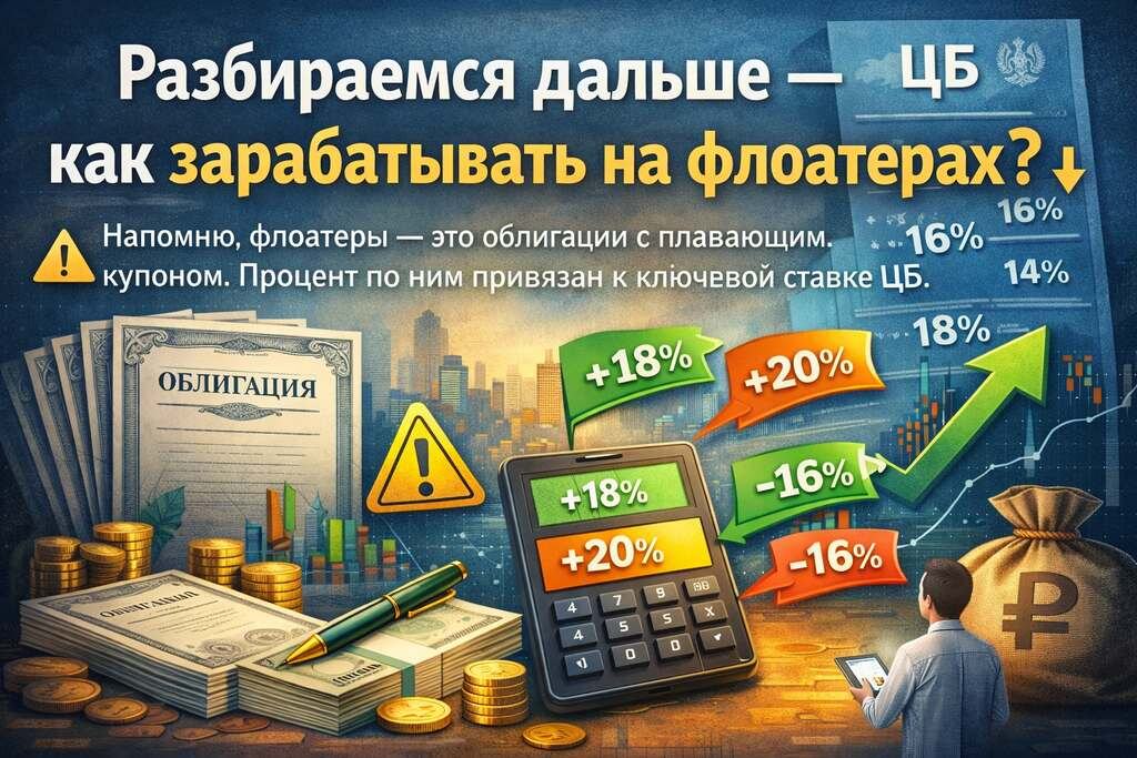 Напомню, флоатеры - это облигации с плавающим купоном. Процент по ним привязан к ключевой ставке ЦБ. Допустим, ставка ЦБ - 16%, а флоатер даёт: ставка + 2%. Значит, сейчас ты получаешь 18% годовых. Если завтра ЦБ поднимет ставку до 18% - твой купон вырастет до 20%. Если опустит до 14% - купон упадёт до 16%. ⚠️ Заработать на росте тела облигации не получится, так как тело этой облигации не реагирует на ставку ЦБ. Зачем они вообще нужны? Чтобы не привязываться к фиксированной доходности на годы вперёд. Минус тоже есть Доходность непредсказуемая. Сегодня 20%, завтра 15%. Для планирования денежного потока - так себе вариант. Но если покупаешь флоатер с ежемесячными выплатами - деньги капают всегда, просто сумма плавает. Стратегия работы с флоатерами Пример 👇 Еще не давно ставка ЦБ была 20%, а доходность по обычным облигациям с фиксированным купоном была 14–16%. Держать их было невыгодно. Оптимальным вариантом было закупиться флоатерами (получать 21–22%) и часть денег переложить на вклады