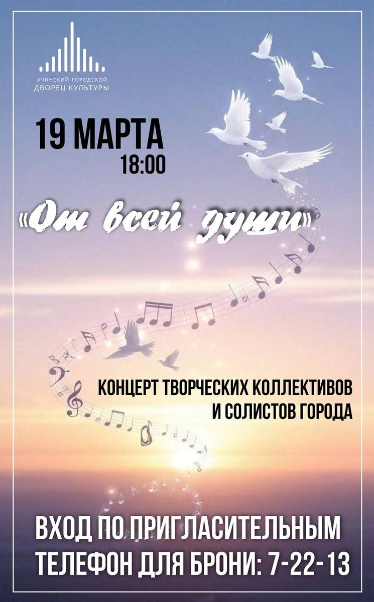 »! ! 🌟 19 МАРТА в 18.00 На сцене городского Дворца культуры выступят талантливые творческие коллективы и солисты нашего города. 🎟️ Вход по пригласительным. Забронировать билет можно в будние дни по телефону: 7-22-13. Не пропустите замечательное событие! 💖