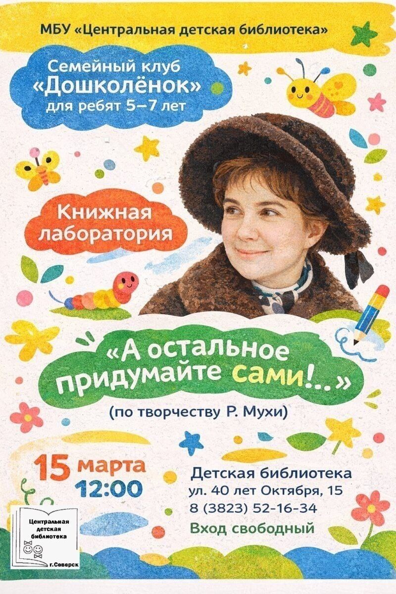 остальное придумайте сами!». На встрече вы познакомитесь с добрыми и озорными стихами детского поэта Ренаты Мухи. Место встречи: ул. 40 лет Октября, 15 Начало встречи: 12:00 #СеверскАфиша