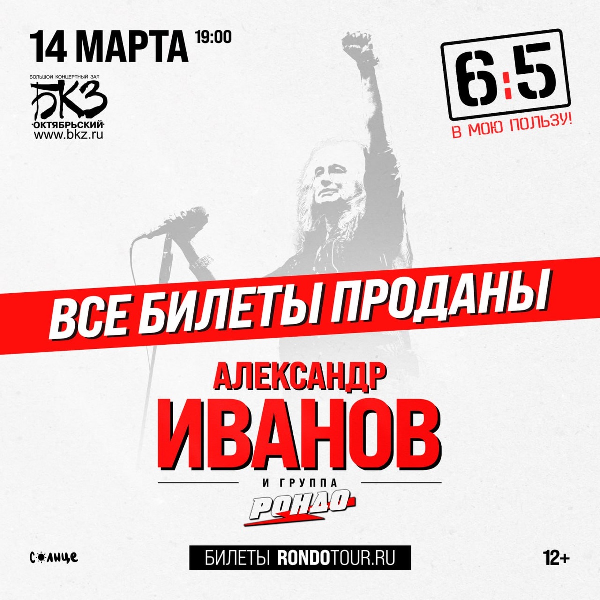 ⭐️️ Дорогие друзья! Напоминаем вам, что уже сегодня вечером в Санкт-Петербурге, на сцене БКЗ «Октябрьский» состоится Юбилейный концерт Александра Иванова и группы «Рондо» под названием «6:5 в мою пользу!». До скорой встречи!🔥
