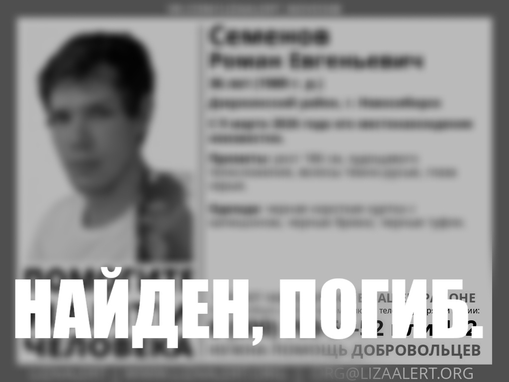 В Новосибирске завершились трагедией поиски 36‑летнего жителя Дзержинского района Романа Семёнова. Мужчина пропал 9 марта — с тех пор о его местонахождении ничего не было известно. Волонтёры отряда «ЛизаАлерт» подключились в поискам пропавшего молодого мужчины только 13 марта. К сожалению, уже сегодня поисковики опубликовали печальное известие: «Найден, погиб» Волонтёры выразили глубокие соболезнования родным и близким погибшего. Подробности трагедии отряд традиционно не разглашает, выяснением всех обстоятельств случившегося занимается полиция. На фото — ориентировка отряда «ЛизаАлерт» https://rberega.info/archives/144982