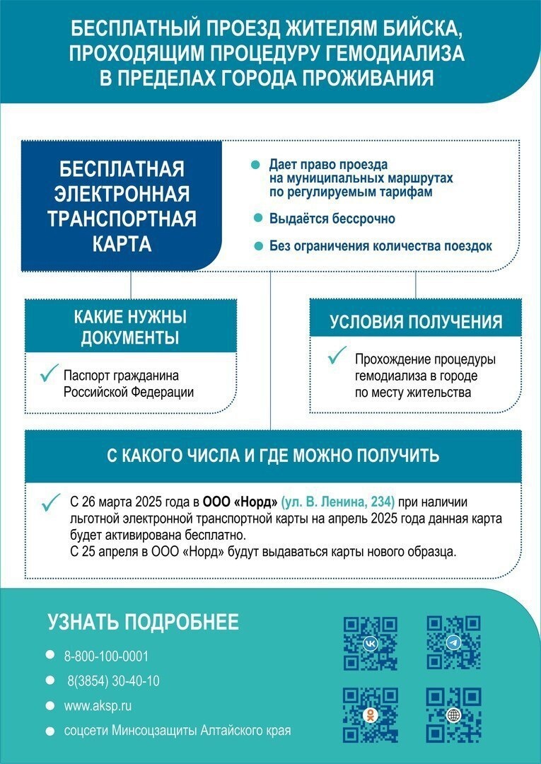 транспорте 📍По инициативе Губернатора Алтайского края В.П. Томенко гражданам, проходящим процедуру гемодиализа, в пределах населенного пункта их проживания, предоставлено право на бесплатный проезд на общественном транспорте без ограничения количества поездок. 👉Где получить бумажный проездной билет - смотрите в карточках 🙌Кроме того, гражданам, направленным для прохождения гемодиализа и проживающим в населенных пунктах, где нет диализных центров, органами социальной защиты населения ежемесячно предоставляется компенсация стоимости проезда. #Алтайскийкрай #Минсоцзащита_22 #Гемодиализ