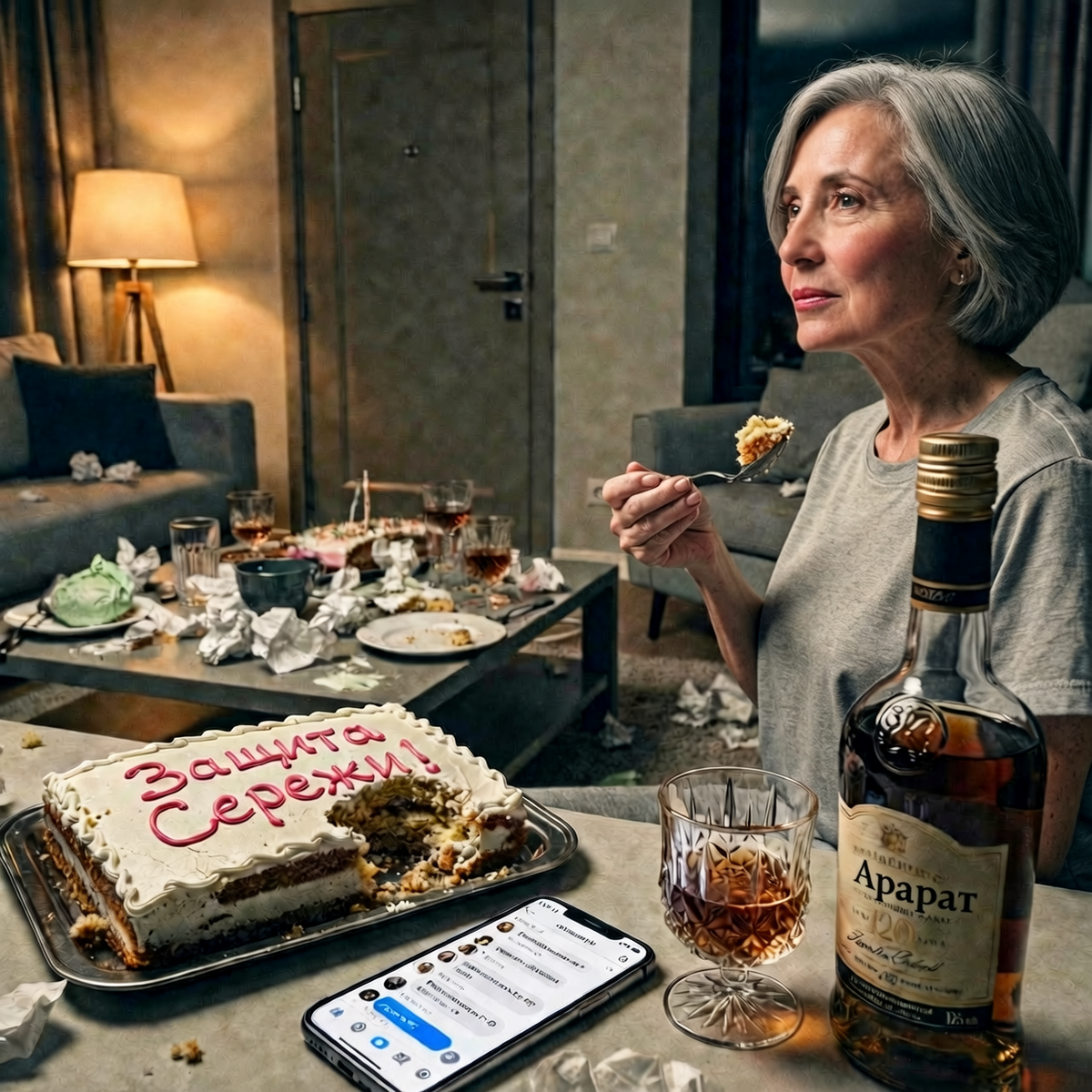 Через час в доме стало тихо. Татьяна закрыла дверь на замок. В гостиной царил хаос, на торте красовалась надпись «Защита Сережи!». Она взяла ложку, отковырнула кусок с этими словами. Слишком сладко — как любит Валентина Петровна.