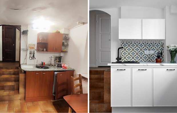 Обновленная кухня решена в белом цвете, что позволило визуально сгладить сложную геометрию помещения. Большие надежды возлагались на сводчатый потолок: по словам заказчицы, под обоями и штукатуркой мог скрываться исторический кирпич, который хотелось расчистить. Однако потолок оказался абсолютно гладким. Зато дизайнеры обнаружили и успешно вывели плесень специальными составами.