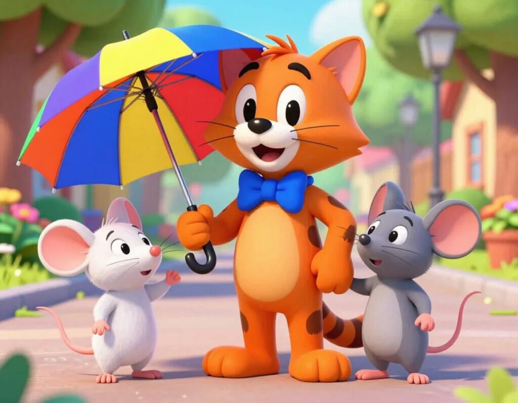 Весёлая сказка «Кот Леопольд и волшебный зонтик» В одном уютном городке, на самой солнечной улице, в доме с зелёной крышей жил кот Леопольд. Он был необыкновенно добрым и всегда говорил: «Ребята, давайте жить дружно!» Леопольд любил выращивать цветы на балконе, печь пироги с вишней и читать книги в гамаке под старой яблоней. Но вот беда — по соседству с ним жили два озорных мышонка: Белый и Серый. Они обожали придумывать разные шалости и вечно пытались подстроить коту какую‑нибудь каверзу. Однажды утром Леопольд вышел на крыльцо с чашкой ароматного какао и заметил под дверью странный подарок — яркий зонтик с узорами в виде рыбок. «Как мило! — обрадовался кот. — Наверное, кто‑то решил сделать мне сюрприз». Не успел он раскрыть зонтик, как тот вдруг засиял всеми цветами радуги и прошептал: «Тот, кто держит меня, получит силу доброты — всё вокруг станет дружелюбным!» Леопольд не поверил своим ушам, но решил проверить. Он вышел во двор, держа зонтик над головой, и тут же увидел мышат, кото