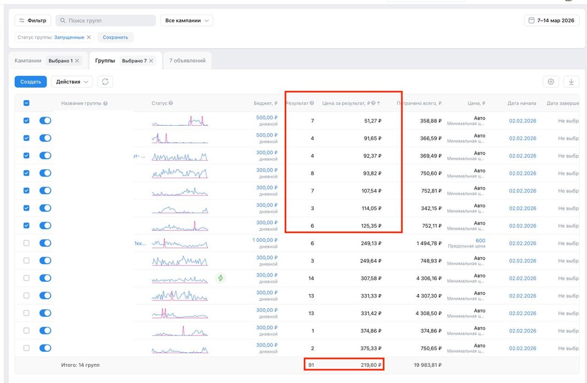 У клиента бюджет 5-6к в сутки. Делаем трафик сразу на все горячие аудитории + тестируем много креативов На скрине видно как 1 крео зацепился и мы его размножили на другие аудитории И тут только 1 креатив дает заявки по 50 до 125р В среднем по активным креативам, которые оставили, заявки выходят по 219р + ндс Ну а если тут быть честным и считать вместе с тестами, то заявка за неделю выходит по 335р, А за последний месяц по 392р В этой нише очень круто срабатывает таргет, если бюджеты идут от 5к в сутки + гео на всю РФ. тк мы даем возможность ВК сделать свою работу и дать нам нужных лидов +Тут стоит отметить, что креативы очень много дают буста. Потому что мы тут изначально тестировали 5 разных форматов. И только 1 из них дает такие результаты Если тебе нужен запуск. Напиши мне в лс @kosenkodeniss