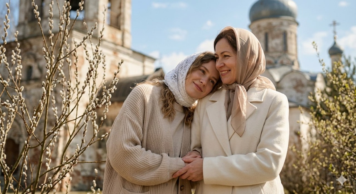 Промпт - мама и дочь у церкви на вербное воскресенье