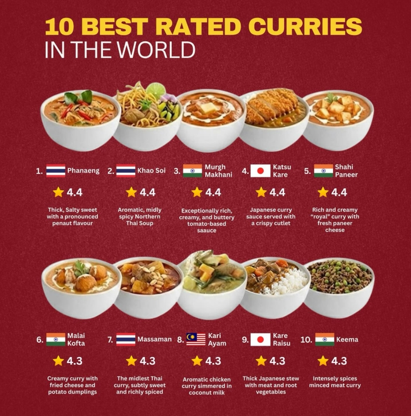 Друзья, гурманы и все, кто неравнодушен к ароматной азиатской кухне! Сегодня у нас отличная новость, которая наверняка порадует всех поклонников тайской кухни! Новый глобальный рейтинг самых популярных карри показал, что тайский пханаенг занял почетное первое место! Его густой, слегка сладковатый соус с выраженными арахисовыми нотками покорил сердца ценителей еды по всему миру, получив оценку 4,4! Но это еще не все! Таиланд продолжает блистать в списке: • На втором месте — Кхао Сой! Этот ароматный суп с лапшой и сливочным бульоном из северной части Таиланда, особенно популярный в Чиангмае, тоже получил высокие оценки. • Также в топ-10 вошел любимый многими Массаман карри, известный своим неповторимым сочетанием специй и легкой сладости. Юго-Восточная Азия в целом показала себя прекрасно, продемонстрировав богатство и разнообразие своих кулинарных традиций. Не отстают и наши соседи: • Из Малайзии отметился ароматный Кари Аям (куриное карри в кокосовом молоке). • Япония представлена сы