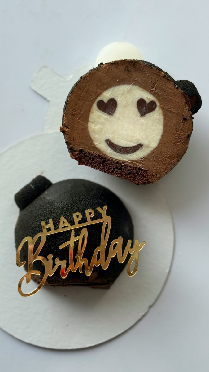Для маленькой детали бомбы ещё раз заморозьте «глазки» и приклейте к торту с помощью этого же заливного шоколада. Поставьте в морозилку на 5-10 минут, после нужно сразу же покрыть велюром.
