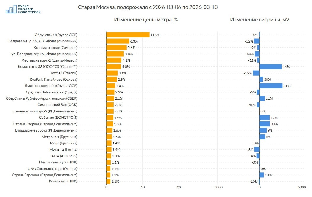 💰 Смотрим без премиум и элит классов. 💵 За 7 дней цена метра снизилась на -0.4% до 502 100 рублей за метр. 📈Топ изменения цен (подорожало): 1️⃣ ЖК "Обручева 30" (Группа ЛСР) цена метра +11.9%, витрина предложения уменьшилась на 65м2 2️⃣ ЖК "Кедрова ул., д. 16, к. 3" («Фонд реновации») цена метра +6.3%, витрина предложения уменьшилась на 650м2 3️⃣ ЖК "Квартал на воде" (Самолет) цена метра +5.6%, витрина предложения уменьшилась на 278м2 🪫Анти топ (подешевело): 1️⃣ ЖК "N’ice Loft" (Coldy) -21.2% в цене, объем витрины при этом увеличился на 11950м2 2️⃣ ЖК "Аура (Москва)" (Мангазея Девелопмент) -12.6% в цене, витрина предложения уменьшилась на 4025м2 3️⃣ ЖК "Level Войковская" (Level Group) -4.9% в цене, витрина предложения уменьшилась на 590м2 ☄️ Объем предложения жилья в регионе вырос на 1.2% (18789 м2) Все изменения в регионе на картинке. ‼️Только для наших подписчиков в телеграмм два сайта - сервис истории цен для поиска выгодных предложений и аналитики по проектам ПИК - рей