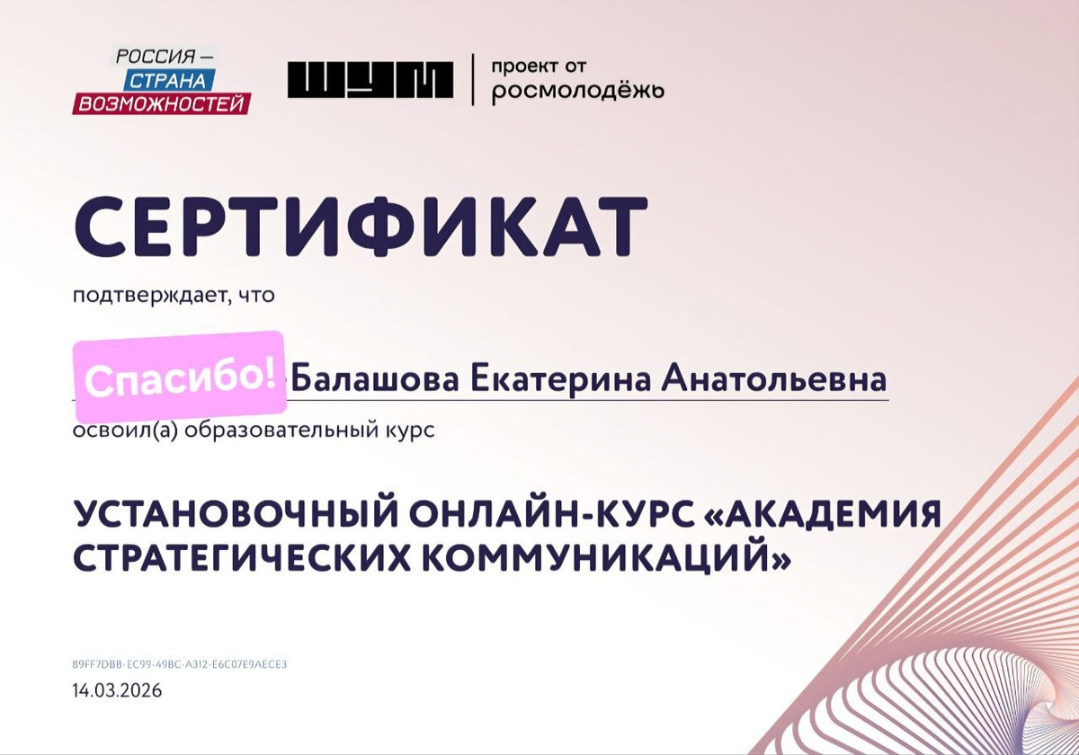 » - федеральной программе подготовки управленцев в сфере стратегических коммуникаций! ✨ Проект реализуется Центром развития молодежных медиа «ШУМ» при поддержке президентской платформы «Россия - страна возможностей» и Администрации Президента РФ. Огромная благодарность организаторам за ценные знания и вдохновение! Получила мощный заряд энергии, новые инструменты для работы и возможность стать частью сильного профессионального сообщества. Очень ценю вклад экспертов и поддержку команды проекта. ❤️ #АкадемияСтратегическихКоммуникаций #ШУМ #РоссияСтранаВозможностей #МолодежьИДети #Развитие #Коммуникации